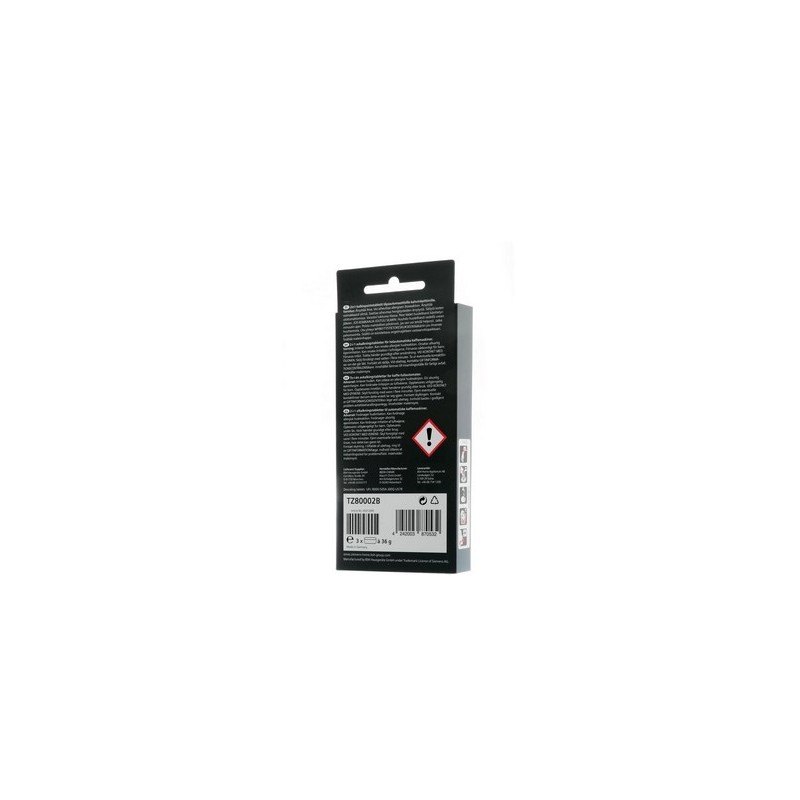 Siemens TZ80002B. Tipo de produto: Cápsula de limpeza, Compatibilidade da marca: Siemens, Compatibilidade: TASSIMO. Quantidade por conjunto: 3 unidade(s). Peso: 36 g. Comprimento da embalagem: 84 mm, Profundidade da embalagem: 22 mm, Altura da embalagem: 164 mm. Quantidade por palete: 1800 unidade(s)