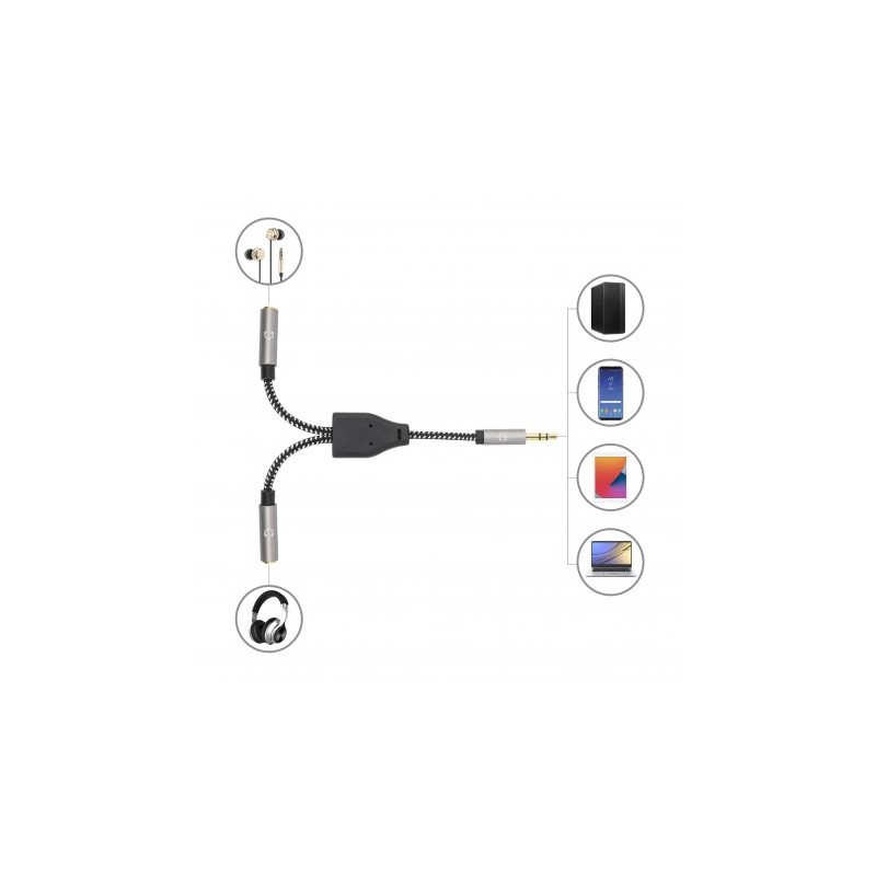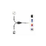 Manhattan 356114. Conetor 1: 3.5mm, Género do conetor 1: Macho, Conetor 2: 2 x 3.5mm, Género do conetor 2: Fêmea, Material do cabo: Cobre, Revestimento dos contactos do conetor: Dourado, Tamanho wire AWG: 28, Comprimento do cabo: 0,15 m, Cor do produto: Preto, Prateado